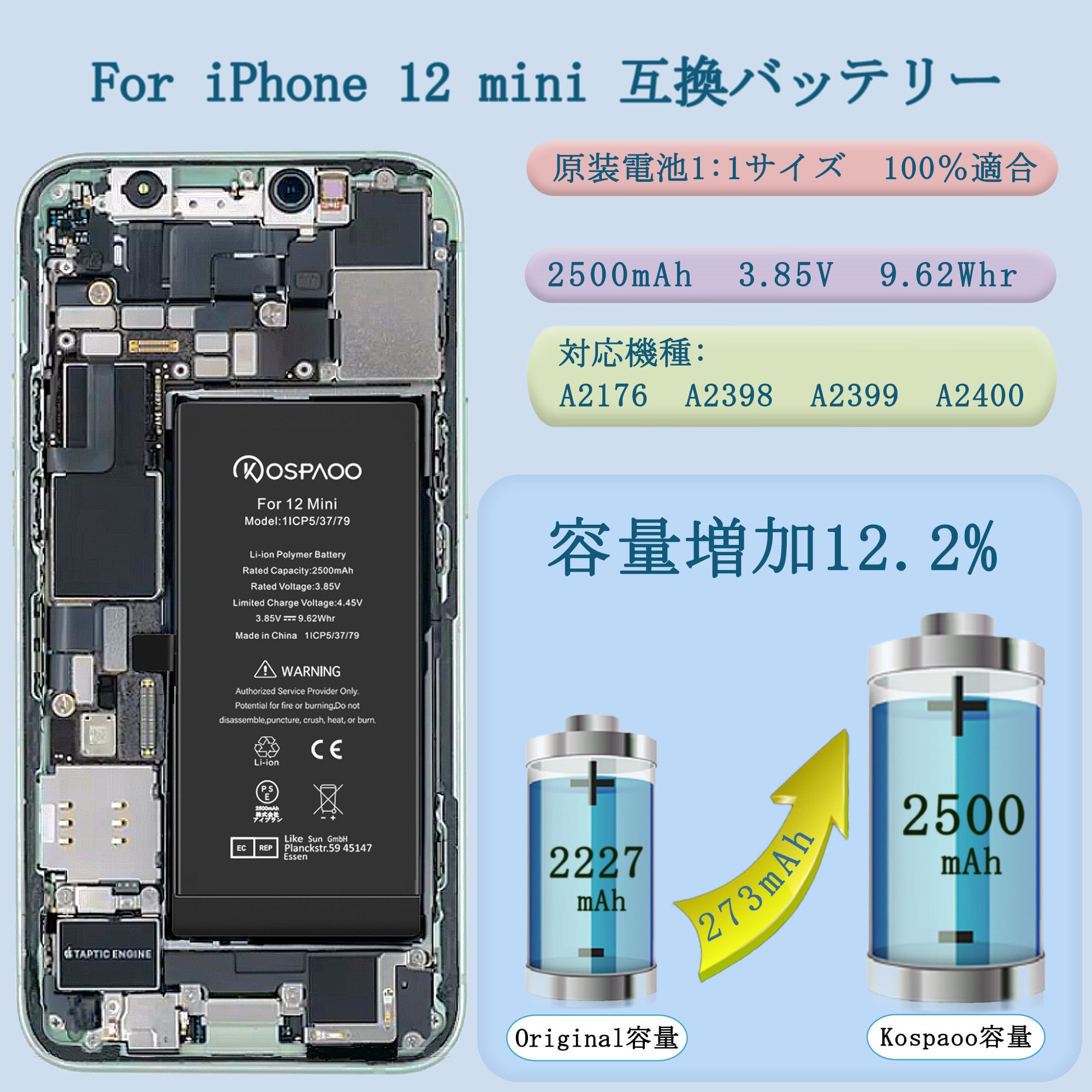 KOSPAOO for iPhone 12 mini バッテリー 互換 大容量2500mAh 3.85V 12.2%増量 日本語説明書 PSE認証 対応A2176/A2398/A2399/A2400機種 交換 修理 電池交換動画付き Li-ion Polymer Battery 高温・低温耐性 600~800サイクル寿命 適用iPhone 12 mini電池【No Tool】