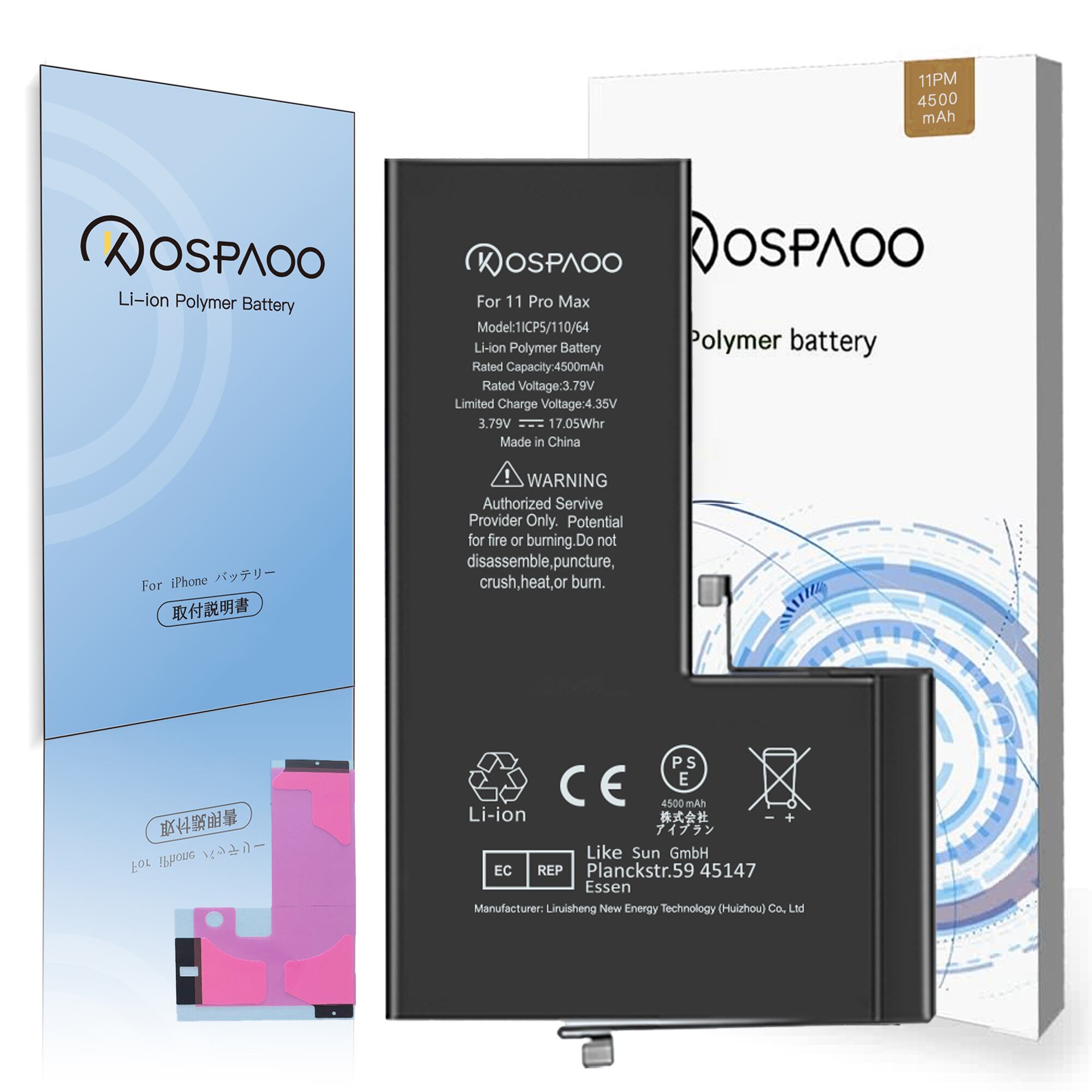 KOSPAOO for iPhone 11 Pro Max バッテリー 互換 大容量4500mAh 3.79V 13%増量 日本語説明書 PSE認証 対応A2218/A2220/A2161機種 交換 修理 電池交換動画付き Li-ion Polymer Battery 高温・低温耐性 600~800サイクル寿命 適用iPhone 11 Pro Max電池【No Tool】