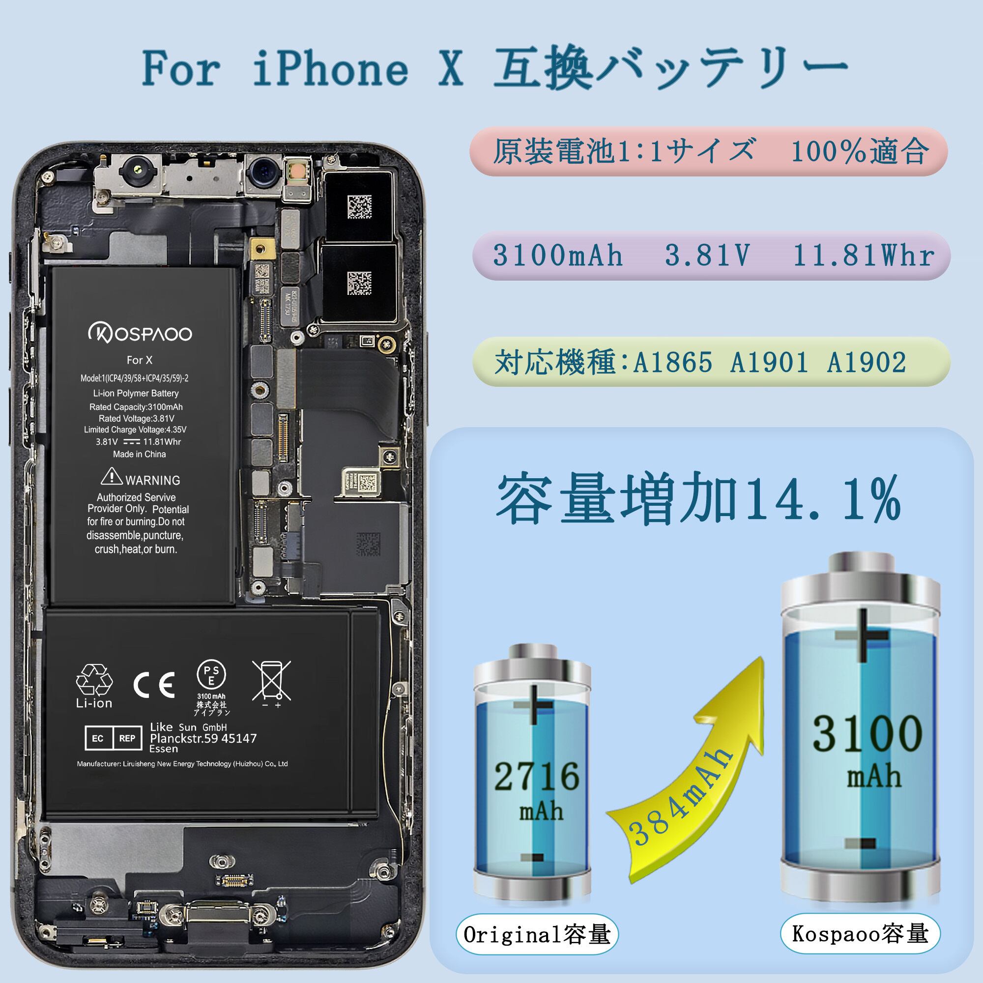 KOSPAOO for iPhone X バッテリー 互換 大容量3100mAh 3.81V 14.1%増量 日本語説明書 PSE認証 対応A1865/A1901/A1902機種 交換 修理 電池交換動画付き Li-ion Polymer Battery 高温・低温耐性 600~800サイクル寿命 適用iPhone X電池【No Tool】