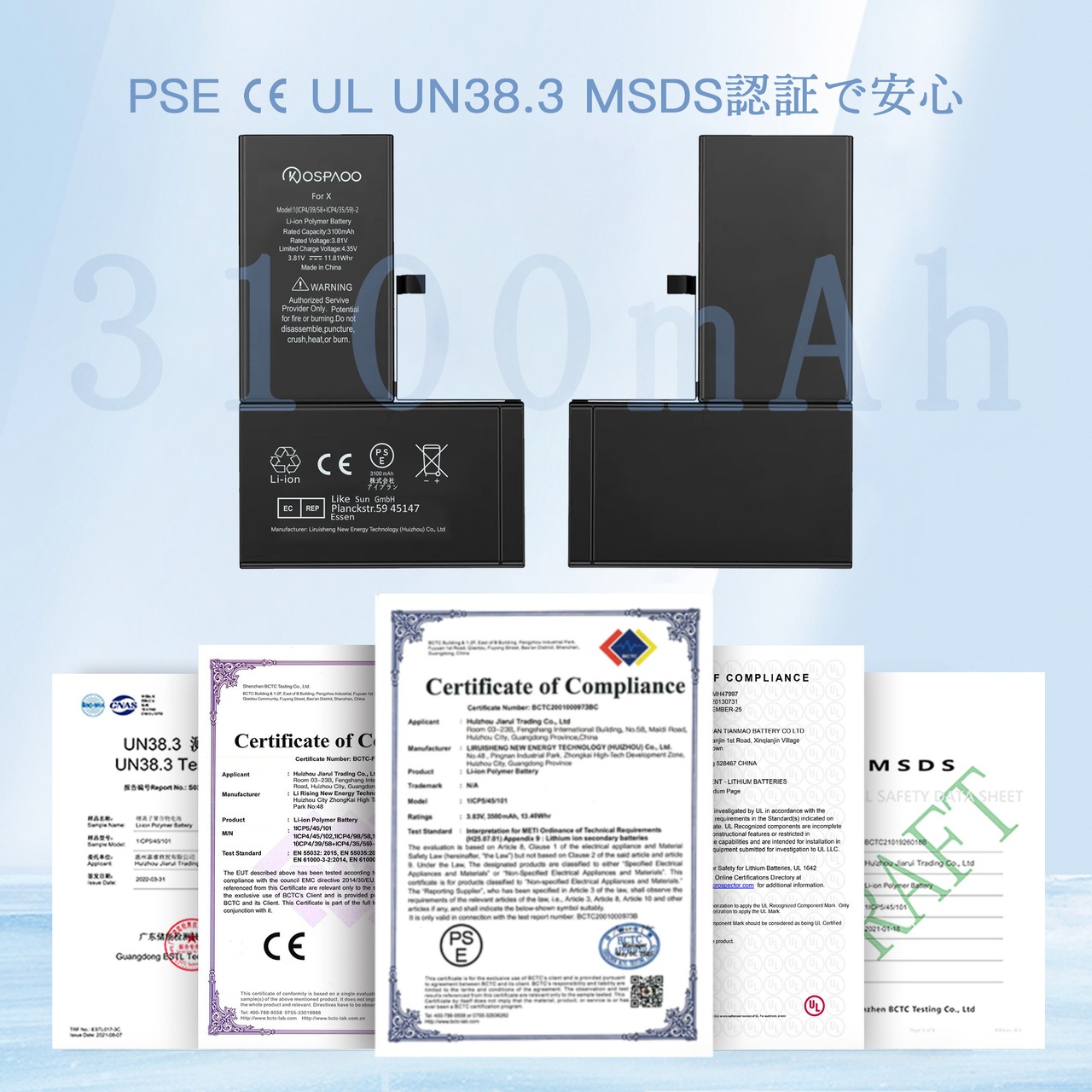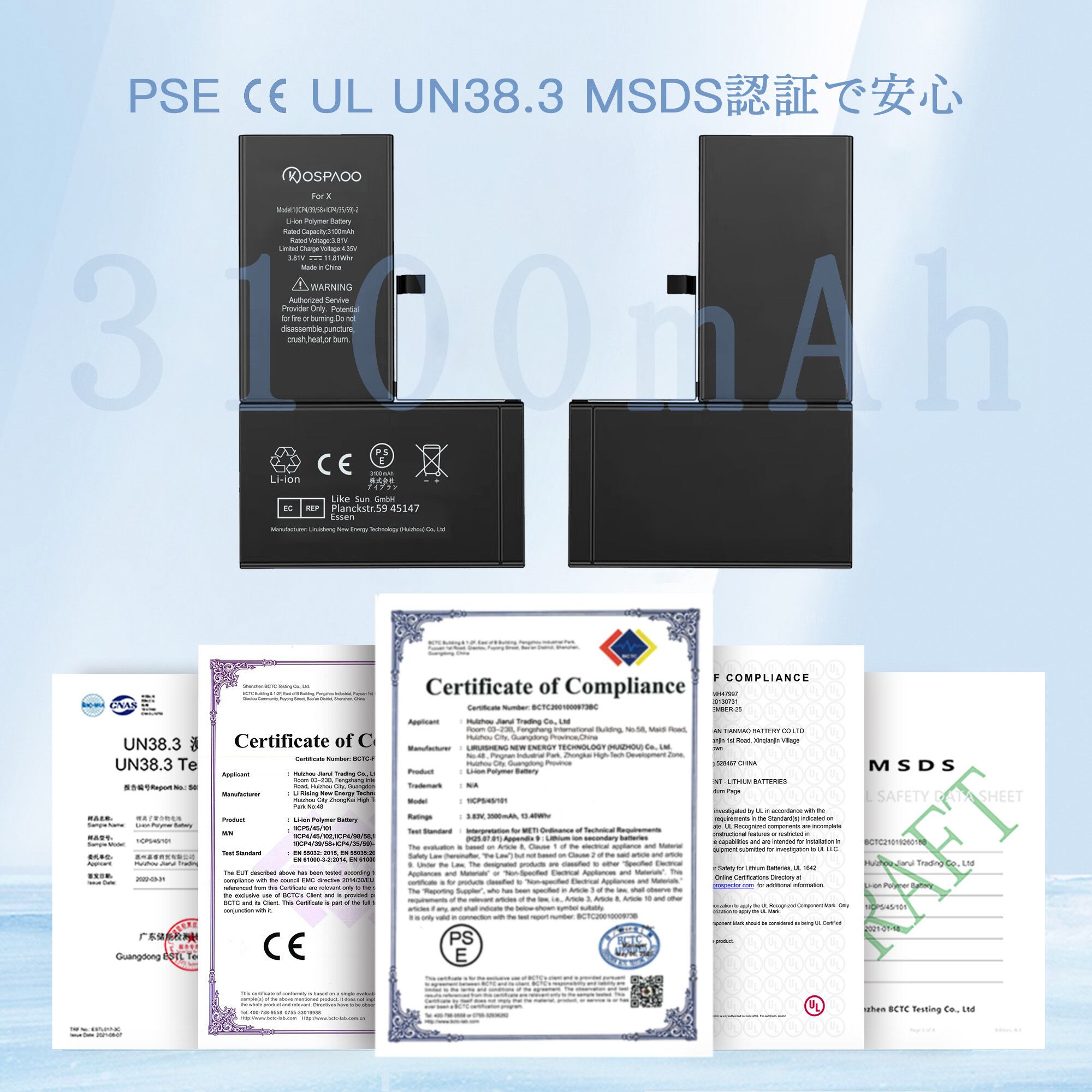 【PSE、CE、ROHS、UL証明書】 私達のiPhone X batteryはPSE、CE、ROHS、UL証明書を取得済みです。 コバルト酸リチウム、グラフェン、有機電解質などの先端材料を使用し、安全性、信頼性、環境性、耐久性、放熱ブロック、極めて膨張しにくいなど、日本や欧州で義務づけられている安全性試験をクリアし、安心して購入できるバッテリーです、適用A1902バッテリー。
