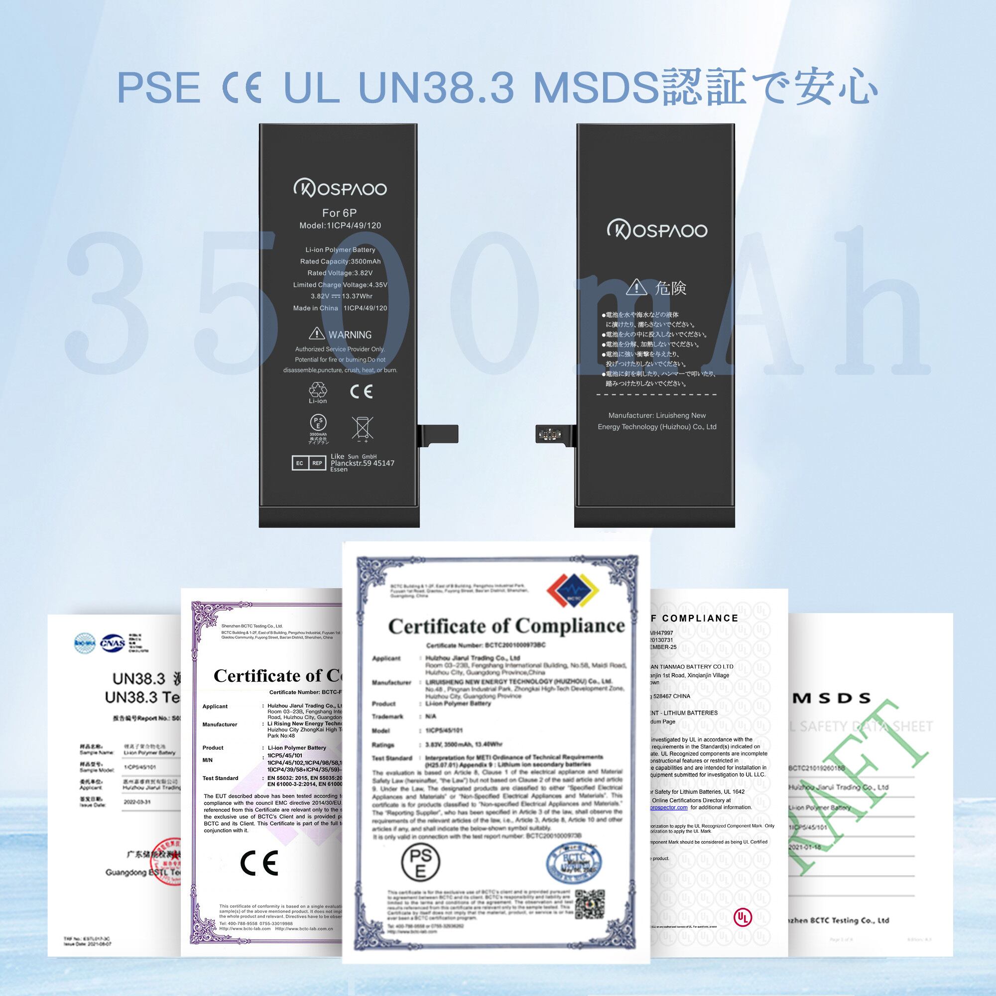【PSE、CE、ROHS、UL証明書】 私達のiPhone 6 Plus batteryはPSE、CE、ROHS、UL証明書を取得済みです。 コバルト酸リチウム、グラフェン、有機電解質などの先端材料を使用し、安全性、信頼性、環境性、耐久性、放熱ブロック、極めて膨張しにくいなど、日本や欧州で義務づけられている安全性試験をクリアし、安心して購入できるバッテリーです、適用A1524バッテリー。