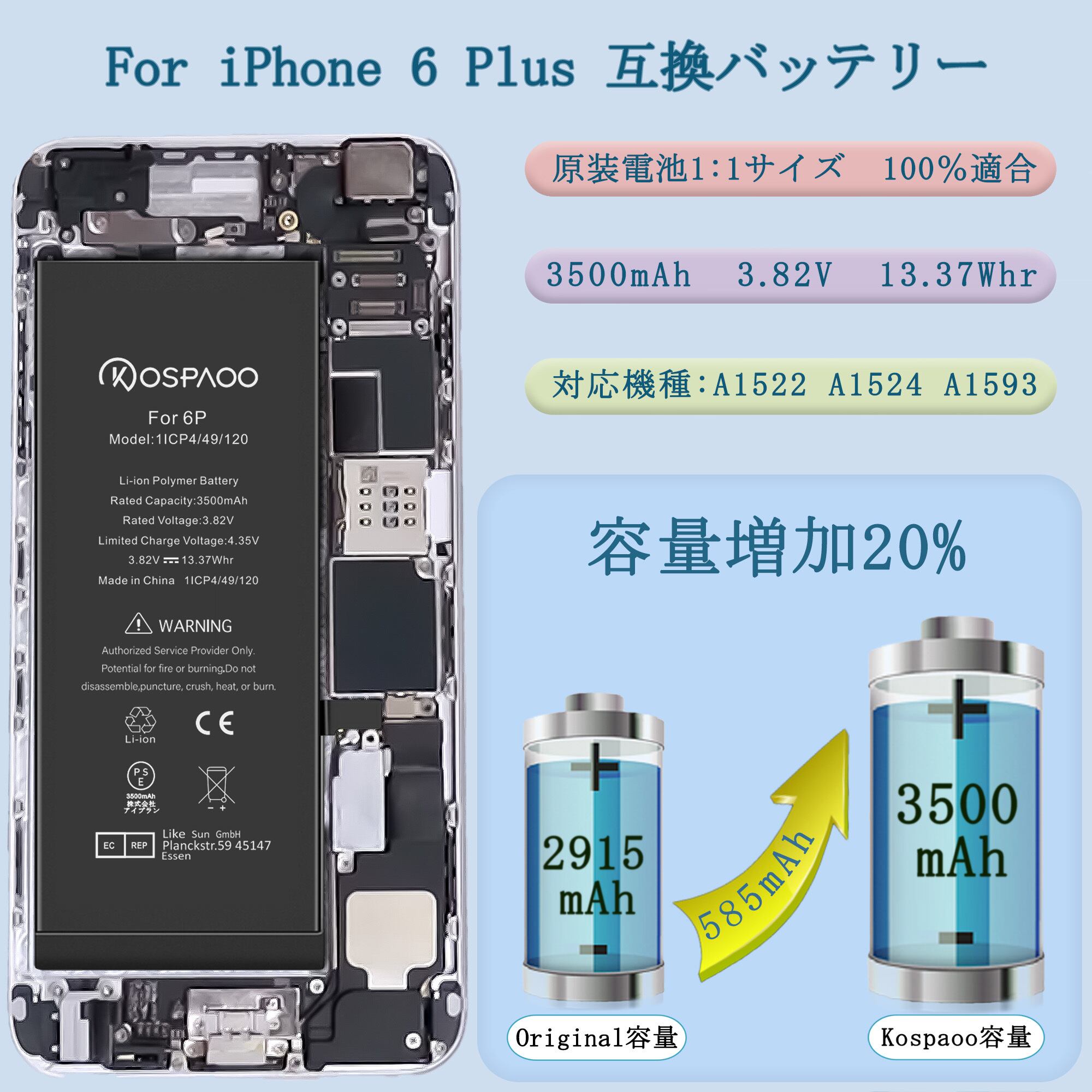 KOSPAOO for iPhone 6 Plus バッテリー 互換 大容量3500mAh 3.82V 20%増量 日本語説明書 PSE認証 対応A1522/A1524/A1593機種 交換 修理 電池交換動画付き Li-ion Polymer Battery 高温・低温耐性 600~800サイクル寿命 適用iPhone 6 Plus電池【No Tool】