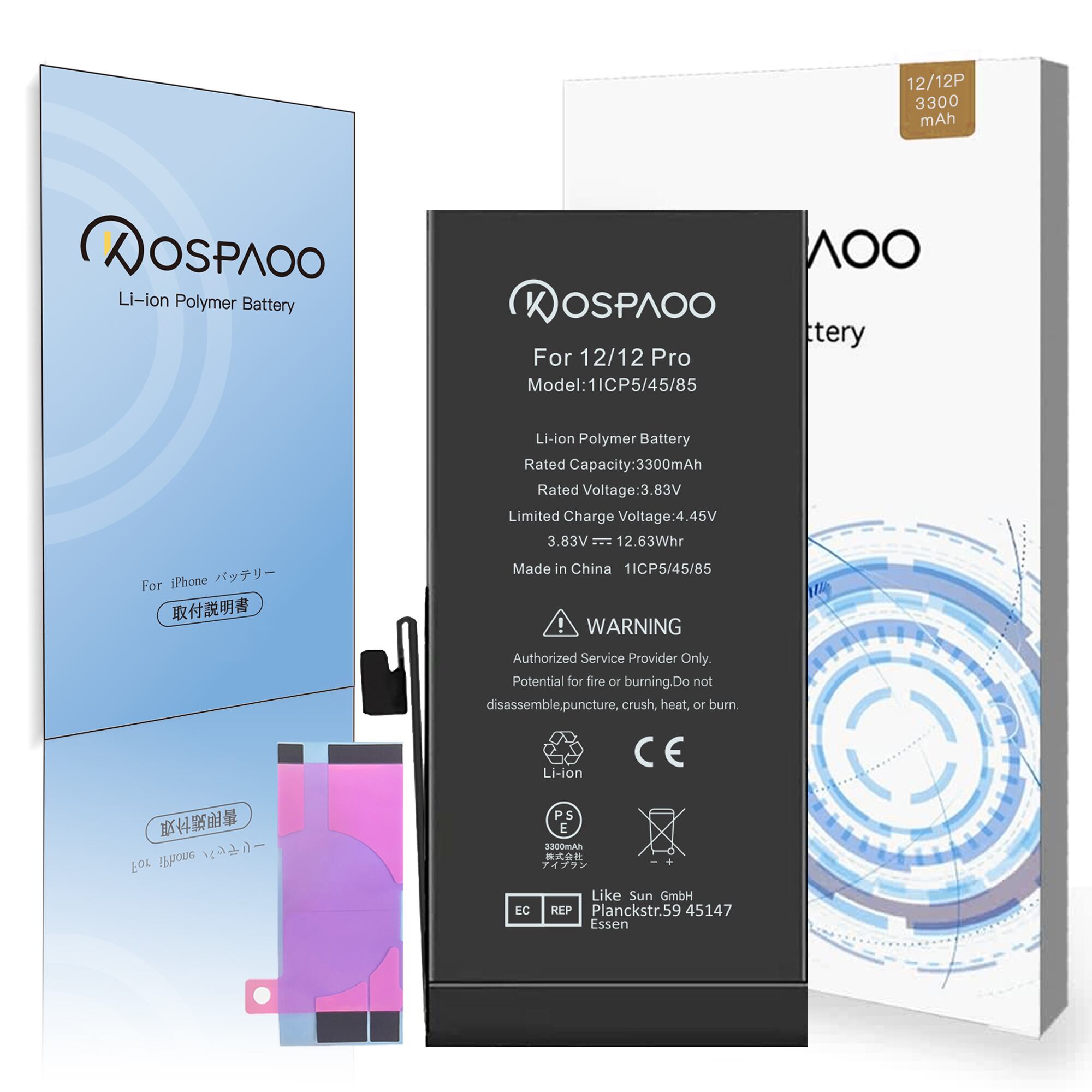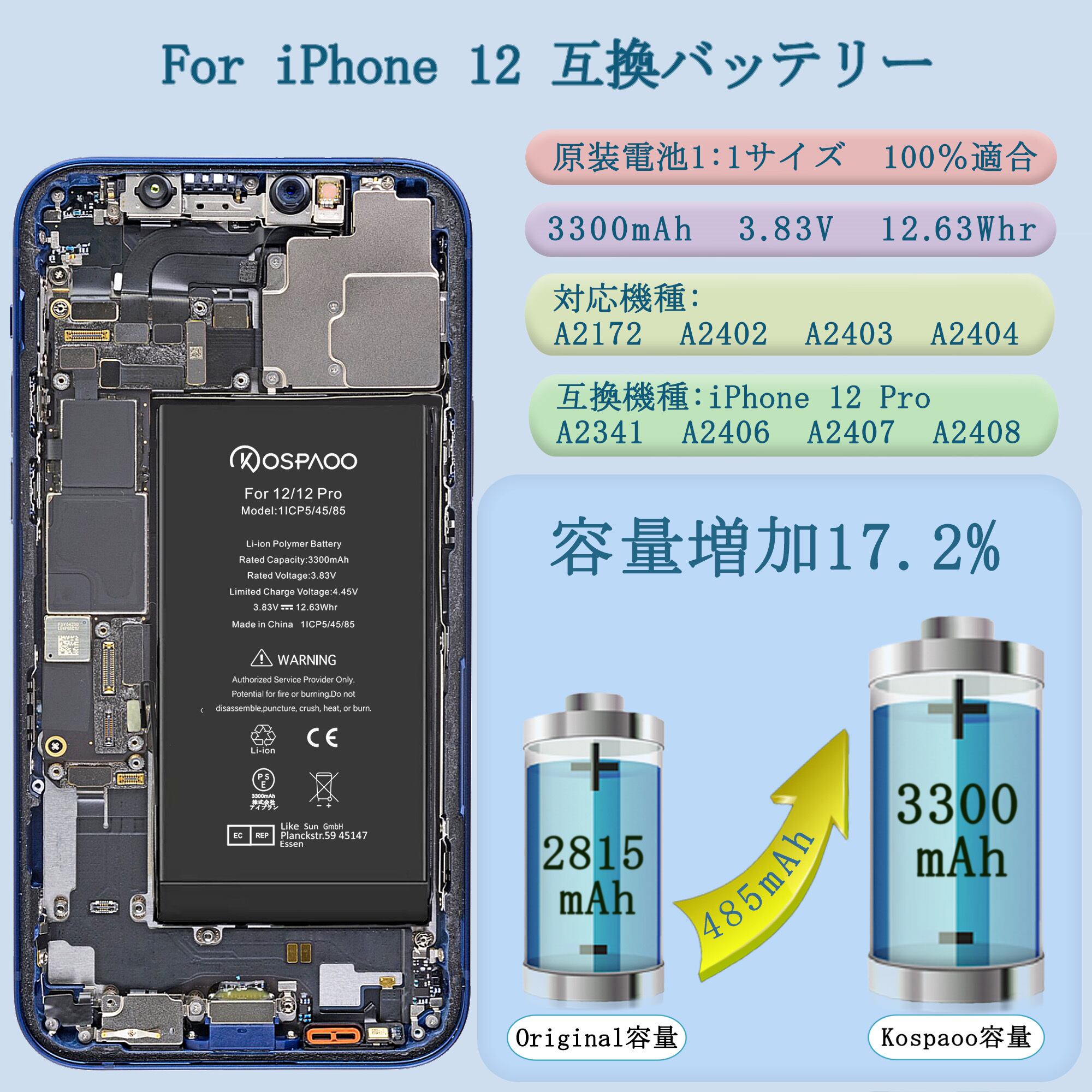 KOSPAOO for iPhone 12/12 Pro バッテリー 互換 大容量 3300mAh 17.2%増量 3.83V 交換修理用 A2479電池 リチウムバッテリー PSE認証 電池交換動画付き 日本語説明書 高温・低温耐性 600~800サイクル寿命 対応iPhone 12 Pro 電池 iPhone 12 battery iPhone 12 Pro battery【No Tool】