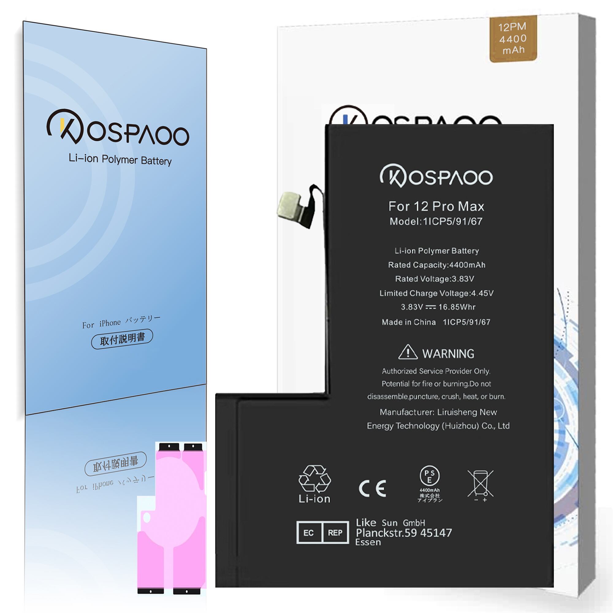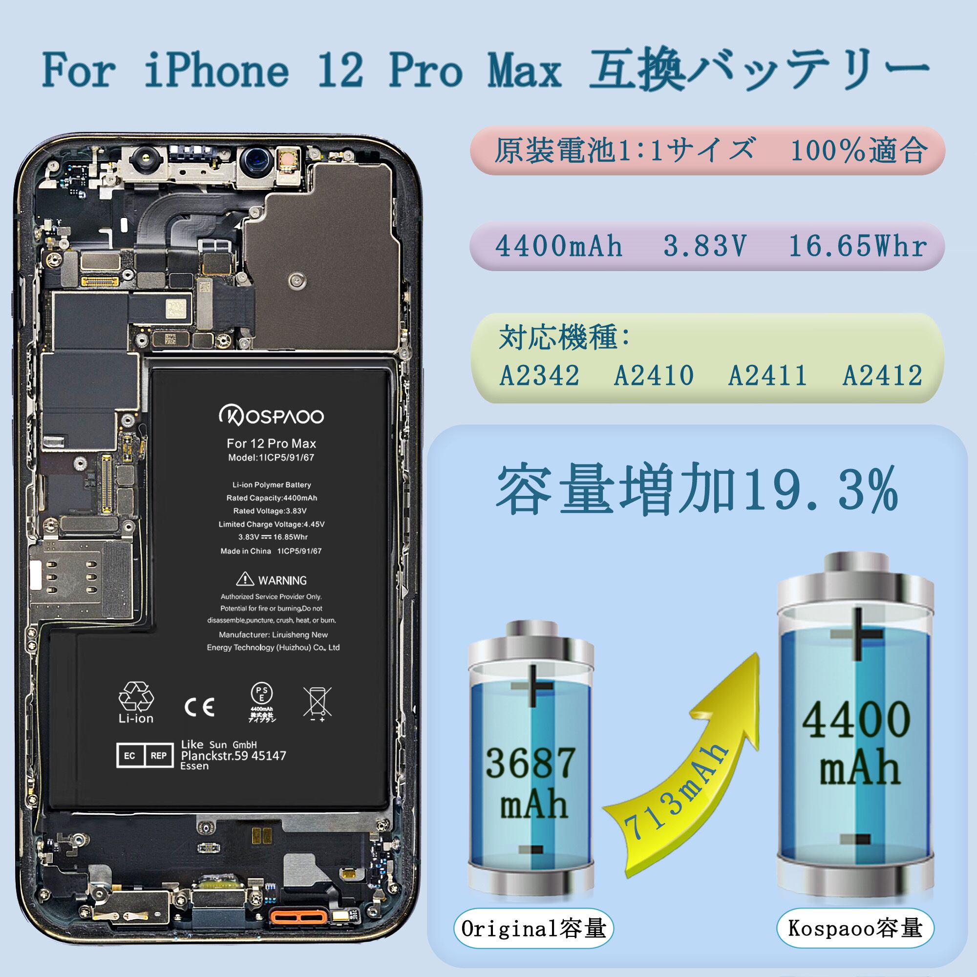 KOSPAOO for iPhone 12 Pro Max バッテリー 互換 大容量4400mAh 3.83V 19.3%増量 日本語説明書 PSE認証 対応A2342/A2410/A2412/A2411機種 交換 修理 電池交換動画付き Li-ion Polymer Battery 高温・低温耐性 600~800サイクル寿命 適用iPhone 12 Pro Max電池【No Tool】