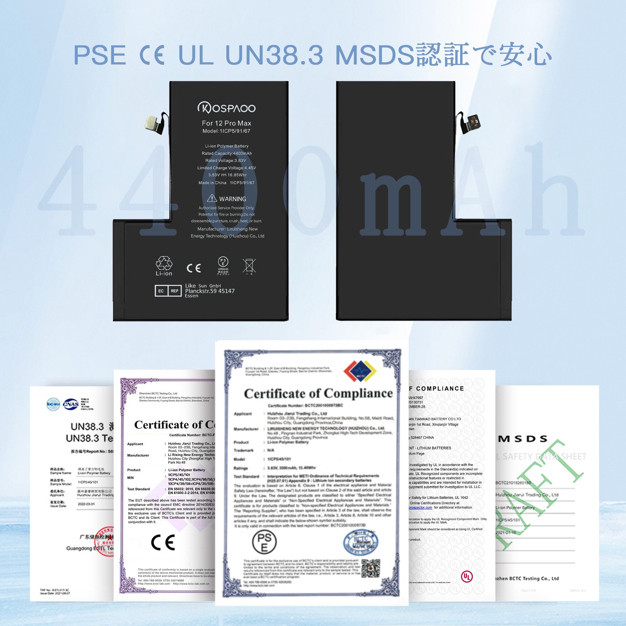【PSE、CE、ROHS、UL証明書】 私達のiPhone 12 Pro Max batteryはPSE、CE、ROHS、UL証明書を取得済みです。 コバルト酸リチウム、グラフェン、有機電解質などの先端材料を使用し、安全性、信頼性、環境性、耐久性、放熱ブロック、極めて膨張しにくいなど、日本や欧州で義務づけられている安全性試験をクリアし、安心して購入できるバッテリーです、適用A2410バッテリー。